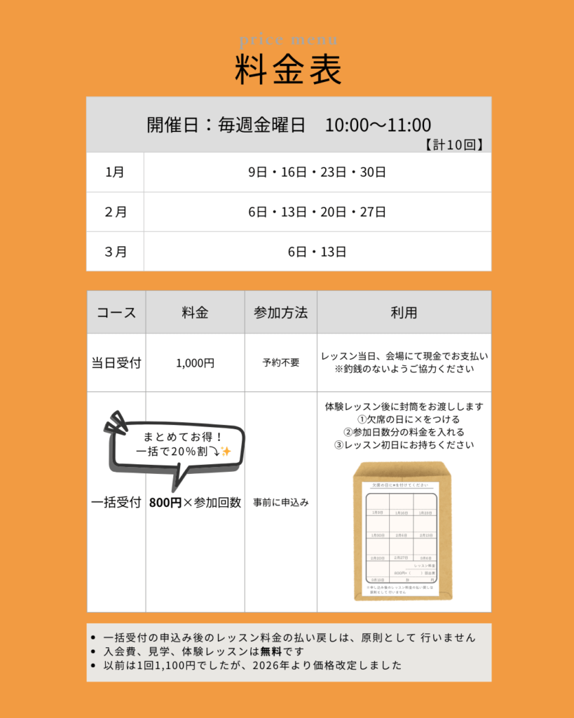 継続:1回800円(参加できる日を事前に一括申し込み)